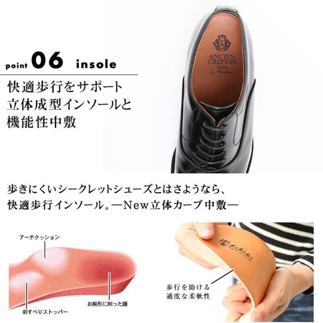 型番: 1301メーカー: 北嶋製靴工業所甲材: 牛革内張り: 豚革中敷き: マリーク(旭化成 抗菌・防臭・防カビ機能)、合成皮革 (ロゴ: ANCIEN CREPINS アンシャンクレパン)靴底: 合成ゴムワイズ: 3Eサイズ: 23.5cm〜26.5cm( 23.5cm 24cm 24.5cm 25cm 25.5cm 26cm 26.5cm )重量: 片足約440g(25.0cm)外見ヒール高: 約3.4cm底全長: 約30cm(25cmサイズ)生産国: 日本( 国産 日本製 Made in Japan )カラー : ブラック ワイン キャメル★送料無料:SALE品を除く★1度目のサイズ交換片道送料無料(当店への返送料はお客様負担となります):SALE品を除くビジネスシューズ シークレットシューズ レースアップ 6cmアップ メンズシューズ ヒールアップシューズ 脚長スタイル 身長アップ ストレートチップ 内羽根 紐 牛革 革靴 ロングノーズ トラディショナル フォーマル 冠婚葬祭 結婚式 披露宴 新郎 成人式 就活 送料無料 キタジマ 北島 KITAJIMA