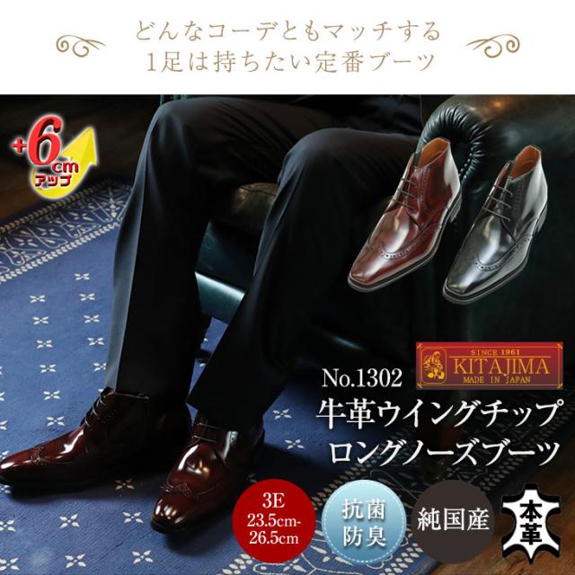型番: 1302メーカー: 北嶋製靴工業所甲材: 牛革内張り: 豚革中敷き: マリーク(旭化成 抗菌 防臭 防カビ機能) 合成皮革 (ロゴ:ANCIEN CREPINS アンシャンクレパン)靴底: 合成ゴムワイズ: 3Eサイズ: 23.5cm〜26.5cm( 23.5cm 24cm 24.5cm 25cm 25.5cm 26cm 26.5cm )重量: 片足約480g(25.0cm)外見ヒール高: 約3.4cm底全長: 約30cm(25cmサイズ)生産国: 日本( 国産 日本製 Made in Japan )★送料無料:SALE品を除く★1度目のサイズ交換片道送料無料(当店への返送料はお客様負担となります):SALE品を除くビジネスシューズ シークレットシューズ ブーツ 6cmアップ シークレットブーツ ヒールアップシューズ 脚長スタイル 身長アップ ビジネスブーツ ウイングチップ 内側ファスナー 革靴 レースアップ 紐 送料無料 キタジマ 北島 KITAJIMA