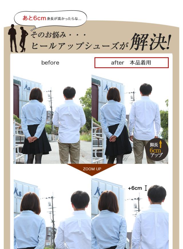 5cm、5.5cm、6cm、7cmアップという表記は靴底のヒール部分込みの構造上の数値ですので、お客様の体重等により、使用時の身長アップ効果に差異が生じます。