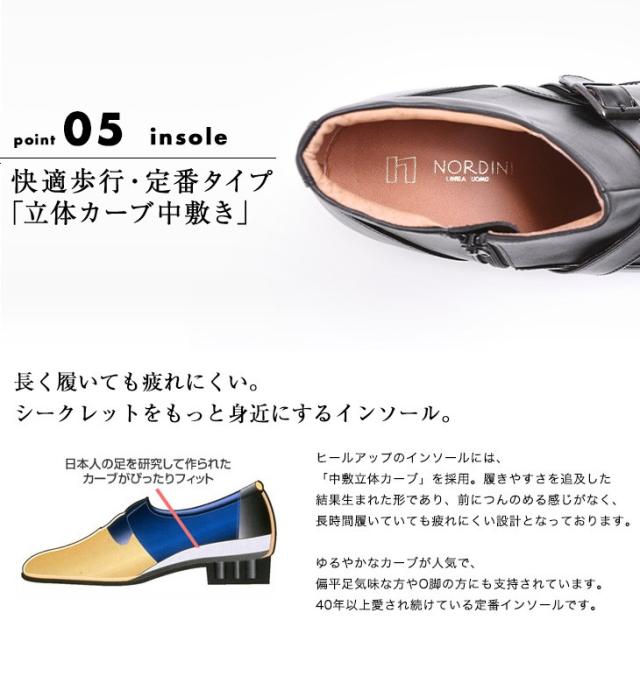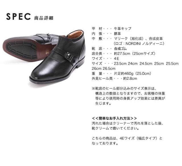 型番: 750メーカー: 北嶋製靴工業所甲材: 牛革内張り: 豚革中敷き: マリーク(旭化成 抗菌 防臭 防カビ機能) (ロゴ:NORDINI ノルディーニ)靴底: 合成ゴムワイズ: 4Eサイズ: 23.5cm〜26.5cm( 23.5cm 24cm 24.5cm 25cm 25.5cm 26cm 26.5cm )重量: 片足約460g(25.0cm)外見ヒール高: 約2.8cm底全長: 約27.5cm(25cmサイズ)生産国: 日本( 国産 日本製 Made in Japan )★送料無料:SALE品を除く★1度目のサイズ交換片道送料無料(当店への返送料はお客様負担となります):SALE品を除くビジネスシューズ シークレットシューズ ブーツ 5cmアップ 革靴 ヒールアップシューズ 脚長スタイル 身長アップ 幅広 ハーフブーツ 牛革 4E ゆったり ファスナー 本革 日本製 国産 送料無料 ワイド キップ 柔らか 本革 送料無料 キタジマ 北島 KITAJIMA