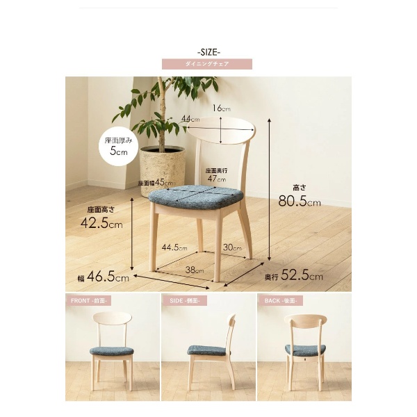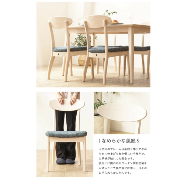 ■カラー ホワイト木目 ■サイズ 本体:幅46.5×奥行52.5×高さ80.5cm 座面高:約42.5cm ■材質 本体:天然木(ラバーウッド)、ウレタン樹脂塗装 座面:ファブリック、ウレタン ■仕様 カラー:ホワイト木目 低ホルムアルデヒド:F☆☆☆☆ 耐荷重:約100kg 完成品 2脚1セット (天然木製品について) 本製品には天然木を使用しているため、 木目や節の位置、木肌の色味などが一点ごとに異なります。 これらは天然木無垢材の特徴であり個性と考えておりますので、 予めご理解の上ご検討をお願いいたします。 ※写真はメーカー様のカタログ等から掲載させて頂いております。 実物の商品と写真の色が若干写真写り等により異なる場合がありますのでご注意くださいませ。 万が一の際でございましても返品はお受け致しかねます。 ※記載は商品仕様の一部です。仕様説明不足等の理由での返品はできません。特に適合等は必ずご確認ください。