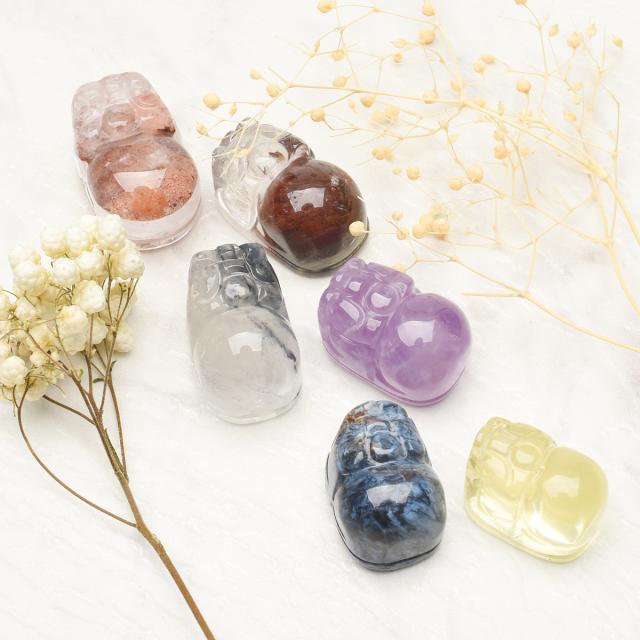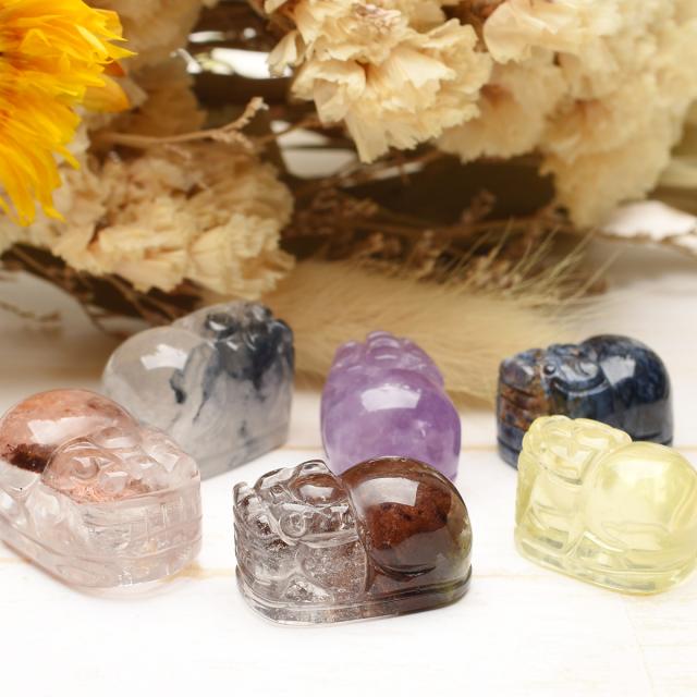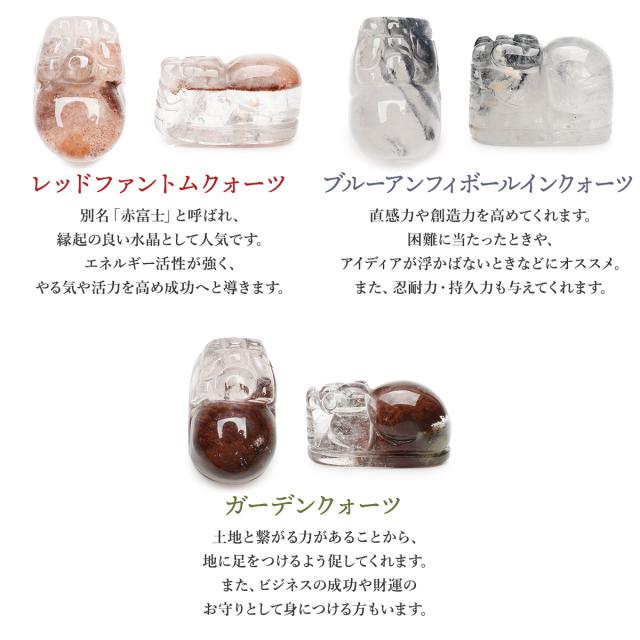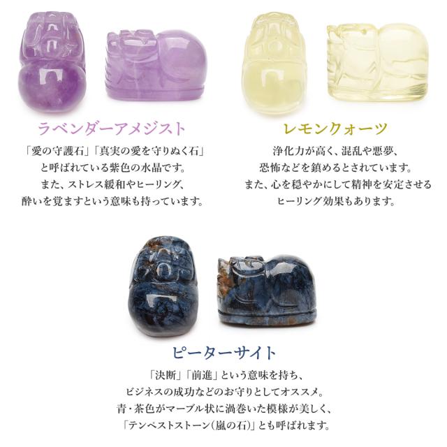| 特徴・意味 | 6種類から選べる 貔貅彫刻のパワーストーン お守り巾着セット ●持ち運びに便利な巾着付き バッグなどに入れて普段からお守りとして持ち歩くことができます。 ※巾着の色・大きさなど予定なく変更する場合がります。 ●貔貅(ひきゅう)とは? 貔貅とは中国の伝説上の生き物で、頭は龍、体は馬で、獅子に近い見た目をしています。 古くは邪悪を避ける動物と言われており、別名「避邪」とも呼ばれていました。 現代では「金を食べるが排泄をしない」という伝説から、招財・蓄財などの金運を司る動物とされています。 ●6種類のパワーストーンからお選びいただけます♪ 【レッドファントムクォーツ】 別名「赤富士」と呼ばれ、縁起の良い水晶として人気です。 エネルギー活性が強く、やる気や活力を高め成功へと導きます。 サイズ1:約20x12mm サイズ2:約17x13mm サイズ3:約21x14mm サイズ4:約20x16mm 【ブルーアンフィボールインクォーツ】 直感力や創造力を高めてくれます。 困難に当たったときや、アイディアが浮かばないときなどにオススメ。 また、忍耐力・持久力も与えてくれます。 サイズ1:約16x13mm サイズ2:約20x15mm 【ガーデンクォーツ】 土地と繋がる力があることから、地に足をつけるよう促してくれます。 また、ビジネスの成功や財運のお守りとして身につける方もいます。 サイズ1:約17x12mm サイズ2:約20x14mm 【ラベンダーアメジスト】 「愛の守護石」「真実の愛を守りぬく石」と呼ばれている紫色の水晶です。 また、ストレス緩和やヒーリング、酔いを覚ますという意味も持っています。 サイズ1:約15x12mm サイズ2:約18x14mm 【レモンクォーツ】 浄化力が高く、混乱や悪夢、恐怖などを鎮めるとされています。 また、心を穏やかにして精神を安定させるヒーリング効果もあります。 サイズ:約17x13mm 【ピーターサイト】 「決断」「前進」という意味を持ち、ビジネスの成功などのお守りとしてオススメ。 青・茶色がマーブル状に渦巻いた模様が美しく、「テンペストストーン(嵐の石)」とも呼ばれます。 サイズ:約17x12mm |