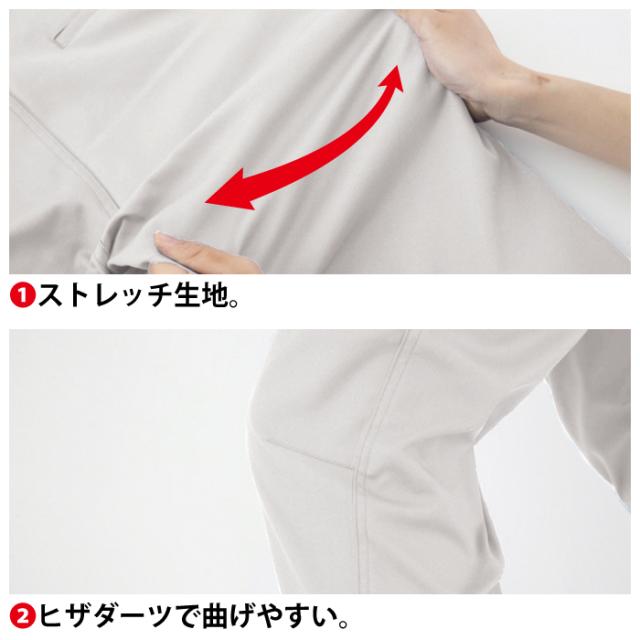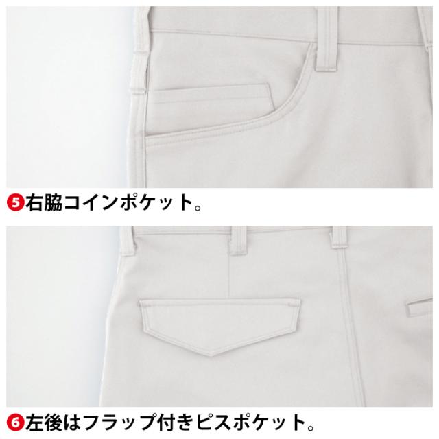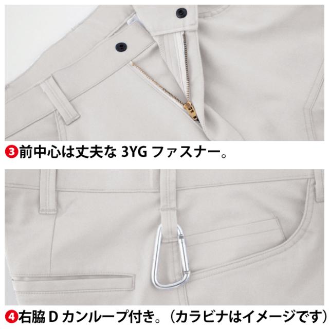 ◇機能:ストレッチ生地・ヒザダーツで曲げやすい・前中心は丈夫な3YGファスナー・右脇Dカンループ付き・右脇コインポケット・左後はフラップ付きピスポケット