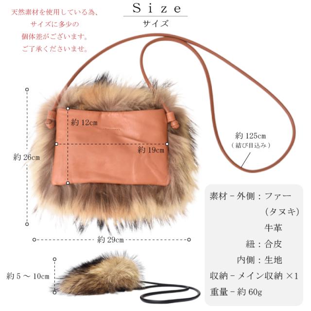 | 特徴 | 【リアルファー】ふわふわで上質なリアルファーを使用しております。天然素材なので毛質も毛色もそれぞれ違います。あなただけの一点ものです。【牛革】バッグ裏側は牛革なのでお洋服に毛が付きにくいデザインです。丈夫で長持ちする素材で、経年変化で味わい深い表情になっていきます。【商品詳細】スマホが横に入ります。内側にスナップボタンがあり、ピタッと閉まるので安心です。スマホ、ミニ財布、キーリングなど…小さいけれど最低限必要なものを収納できます。ショルダー紐部分はコブをほどいて結び直すことで長さ調節が可能です。紐を外せばクラッチバッグのように使えます。【こんな方におすすめ!】・必要なものだけ入るサイズのバッグがいい。・ブランドじゃなくていいけど、品質の良いバッグを持ちたい。・身に着けたまま運転したり自転車に乗れるバッグがいい。【ご注意下さい】みなさまにお求めやすい価格でご提供できるよう、ポストインで発送することで送料を抑えております。その為、開封後に毛が寝てしまっている場合がございます。商品到着後はなるべくお早目に開封して頂き、風通しが良く、日陰になる場所でハンガーにかけておくと自然と毛のボリュームが戻ってきます。ぜひお試し下さいませ。お手入れ方法を記載したカードをお付けしてお送り致します。 |