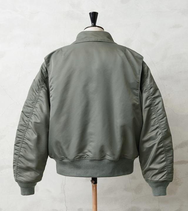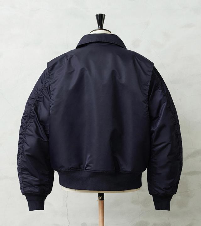 WAIPER.incではより普段着として着用しやすいようにMA-1にも採用された、肉厚のしっとりとしたナイロンツイルを使用することでアレンジを加えさせていただきました。特徴的なディテールとして、CWUのポイントである背中のアクションプリーツ。さらに裏地のキルティングは70年代の個体にみられる背中心で接いだバイアスのキルティングを再現しています。
