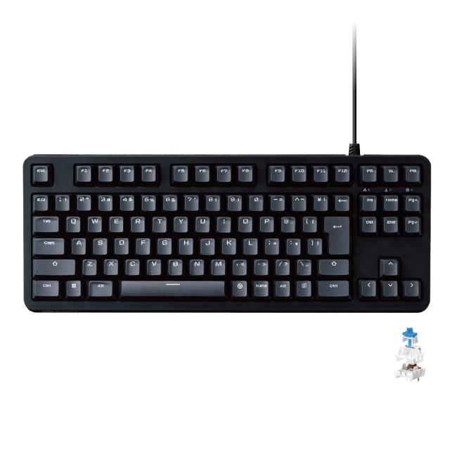 ゲームプレイ中の高速操作でもミスしにくい独自開発のネオクラッチキーキャップを搭載! 全キーロールオーバーにも対応し、押し感とクリック音が分かりやすい青軸を採用したテンキーレスゲーミングキーボードです。<br>すべてのキーが同時入力が可能な“Nキーロールオーバー”に対応しています。複雑なキーの同時押下が必要なゲームでも、操作を取りこぼすことなく正確に入力できます。<br>押下する感触と音が分かりやすい青軸(クリッキー)を搭載しています。<br>激しいキー入力にも耐える5000万回高耐久メカニカルスイッチを採用し、キーは視認性に優れたステンシル調のフォントを印字しています。<br>Windowsキー/メニューキーの操作を無効にするゲーミングモードを搭載しており、ゲームプレイ中の不意のゲーム中断をなくします。<br>◆商品名:エレコム ゲーミングキーボード 有線 メカニカル 5000万回高耐久スイッチ採用 全キーロールオーバー クリッキー 青軸 日本語配列 テンキ<br>【 仕様 】