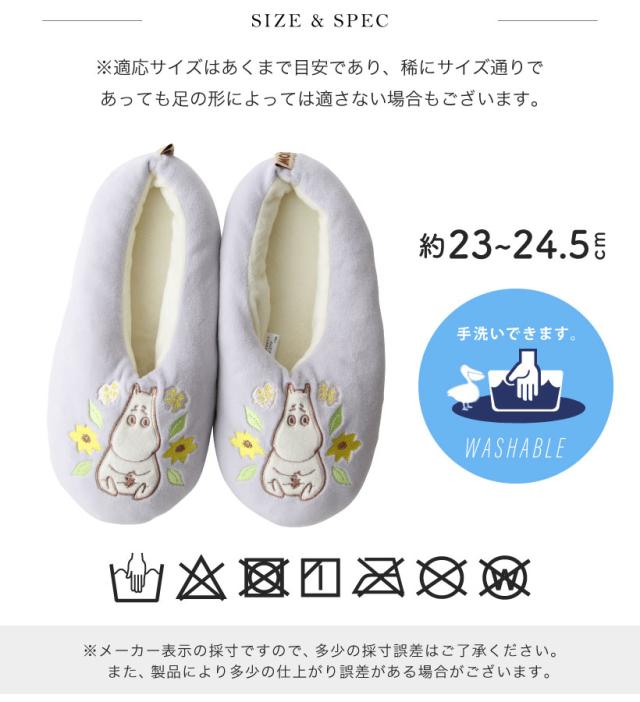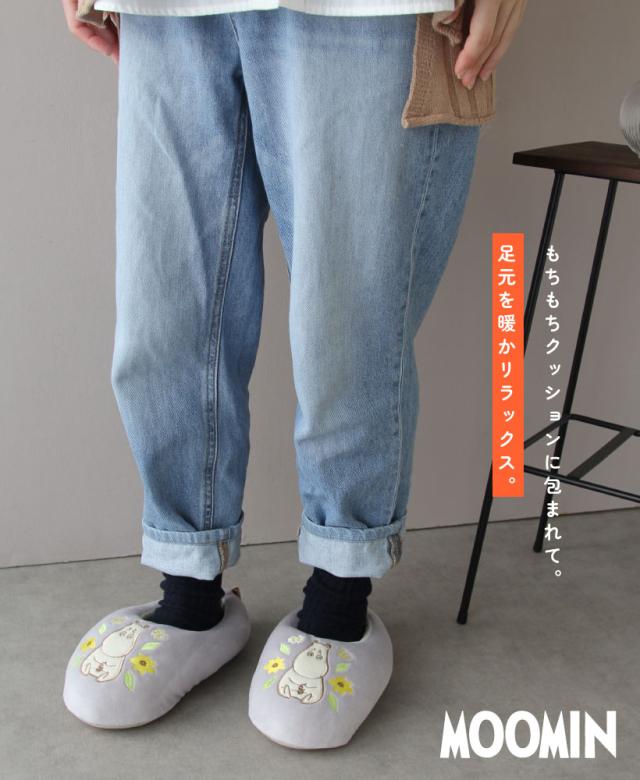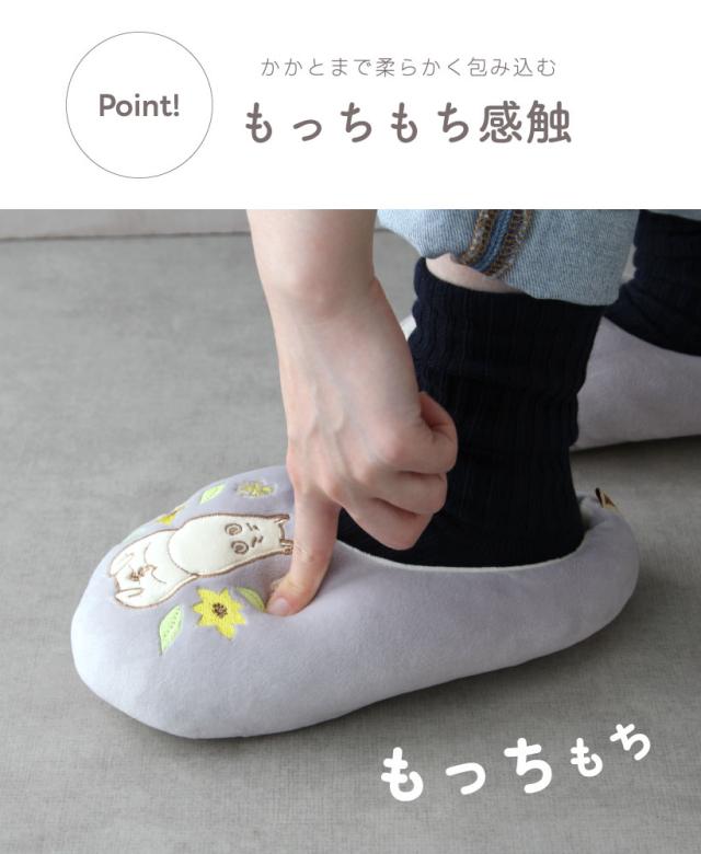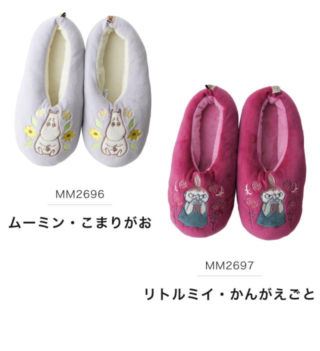 もちもちマシュマロタッチのルームシューズ。足もとを見るたび、ムーミンとミイのアップリケに癒されます!ふんわりと足元を包み込み、冬の寒い時期でも快適に過ごせます。プレゼント・ギフトにもおすすめです。※滑り止め加工はされておりませんので、ご使用の際はご注意ください。