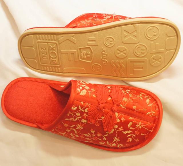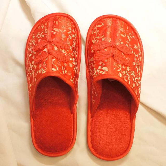 サテン製 チャイナ風 キッチン スリッパ レッド色 24cm〜25cm