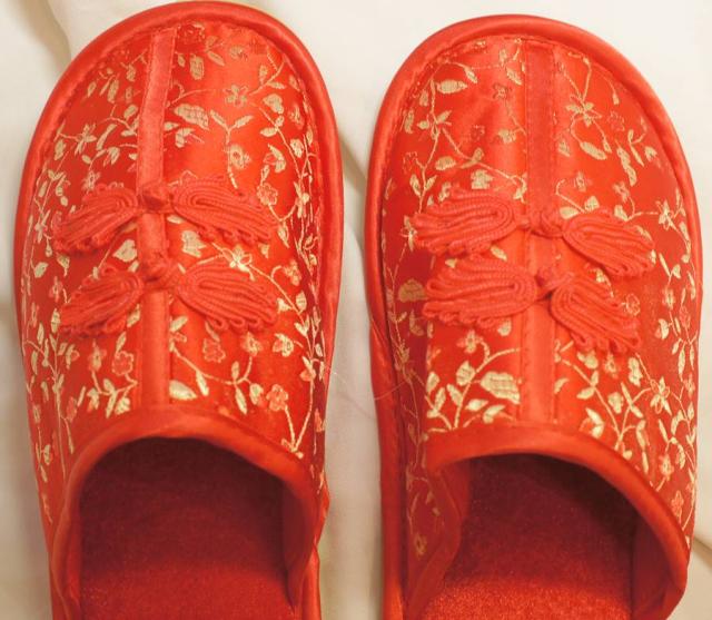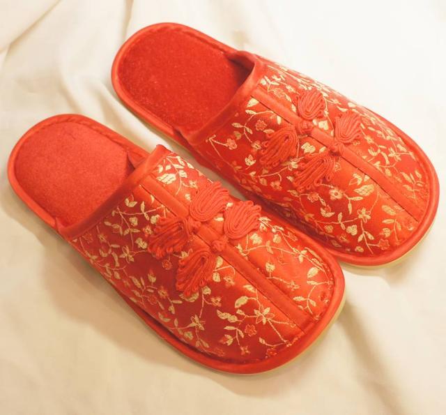 サテン生地で制作された可愛い中華風スリッパ!!チャイナボタンも素敵!