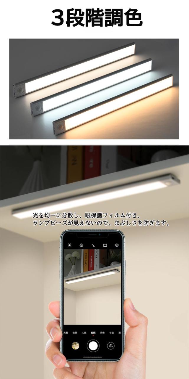 従来単色センサーライトに比べて、暖色(電球色)、白色(ニュートラル)、昼白色の3色オプションに進化されます。いつもお好きな照明色を選択できます。目を傷つけたり、周りの人に迷惑をかけたりしない調光できます。光を均一に分散し、眼保護フィルム付き、ランプビーズが見えないので、まぶしさを防ぎます。進化版キッチン用センサーライトは、お好きなライト色、お好きな照明輝度を自由調整でき、素晴らしい体験感や使用感を与えます。