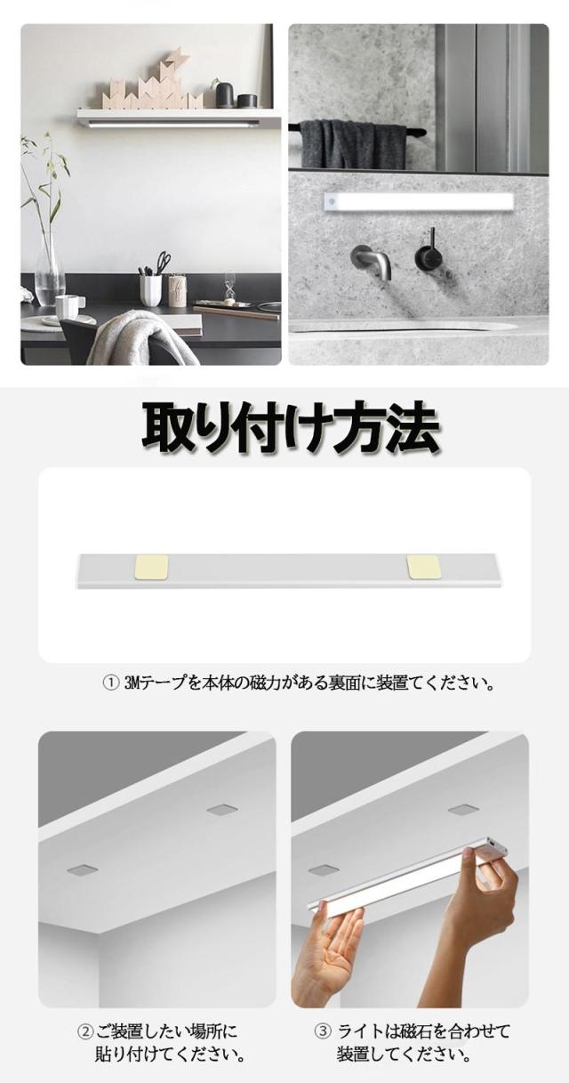 市場に流れているセンサーライトと比較して、弊社のは強力マグネットが付き、工具不要で鉄面に簡単に取り付けでき、いつでもセンサーライトを外せて懐中電灯としても使用可能です。また、新設計した強い粘度の3Mテープ付き、お手軽い階段・寝室・廊下・玄関・キッチンなどご装置したい場所に貼り付けできます。充電式リチウムイオン電池を内蔵しているので、電池交換の面倒もないし、配線やコンセント接続の必要もありません(USBケーブルが付属)