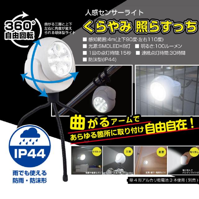 センサーライト 人感 くらやみてらすっち 防犯 屋外 電池式 ( 人感センサーライト 配線不要 三脚 マグネット 自由自在 防犯ライト 防犯対策 玄関 駐車場 庭 照明 ライト 自動点灯 防雨 防沫 空き巣対策 防犯グッズ 災害 懐中電灯 )