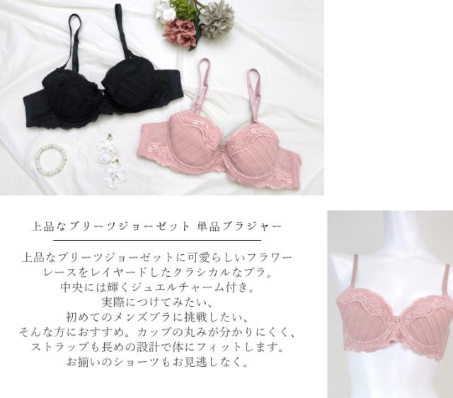 上品なプリーツジョーゼットに可愛らしいフラワーレースをレイヤードしたクラシカルなブラ。中央には輝くジュエルチャーム付き。実際につけてみたい、初めてのメンズブラに挑戦したい、そんな方におすすめ。カップの丸みが分かりにくく、ストラップも長めの設計で体にフィットします。お揃いのショーツもお見逃しなく。