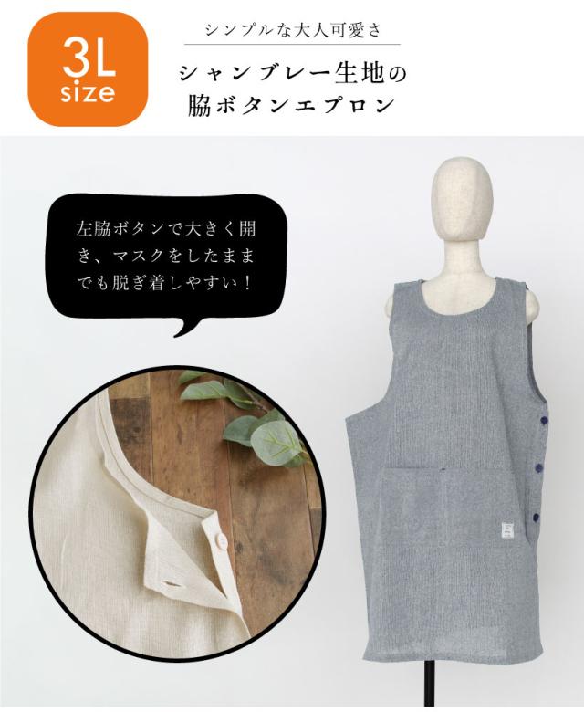 【メール便1枚のみ送料無料】シャンブレー 脇ボタンエプロン【大きいサイズ】 3L シンプル コットン サイドボタン 母の日【N】【M】