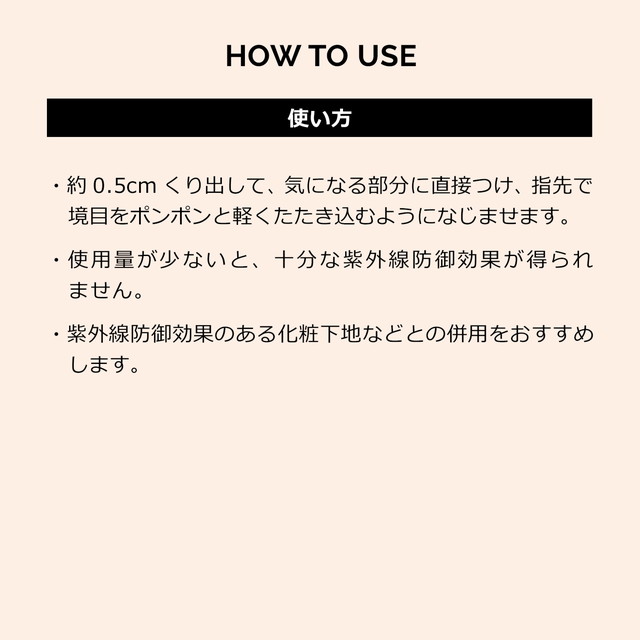 【ミディアムオークル】ジメチコン、パラフィン、メトキシケイヒ酸エチルヘキシル、グリセリン、水、DPG、ネオペンタン酸イソデシル、BG、水添ポリイソブテン、ポリリシノレイン酸ポリグリセリル−6、PEG−10ジメチコン、ポリエチレン、ジステアルジモニウムヘクトライト、グリシルグリシン、塩化Na、酢酸トコフェロール、アセチルヒアルロン酸Na、コウホネエキス、水溶性コラーゲン、マイクロクリスタリンワックス、ビスブチルジメチコンポリグリセリル−3、水酸化Al、テトラヒドロテトラメチルシクロテトラシロキサン、テトラデセン、ハイドロゲンジメチコン、シメチコン、トコフェロール、BHT、シリカ、酸化亜鉛、セチルPEG/PPG−10/1ジメチコン、パルミチン酸デキストリン、トリエトキシカプリリルシラン、フェノキシエタノール、酸化チタン、酸化鉄、マイカ、硫酸Ba生産国 日本 ※ こちらの商品は国内正規品となります。 紫外線防止効果 SPF50・PA++++ 香り 無香料 使用方法 ・約0.5cmくり出して、気になる部分に直接つけ、指先で境目をポンポンと軽くたたき込むようになじませます。