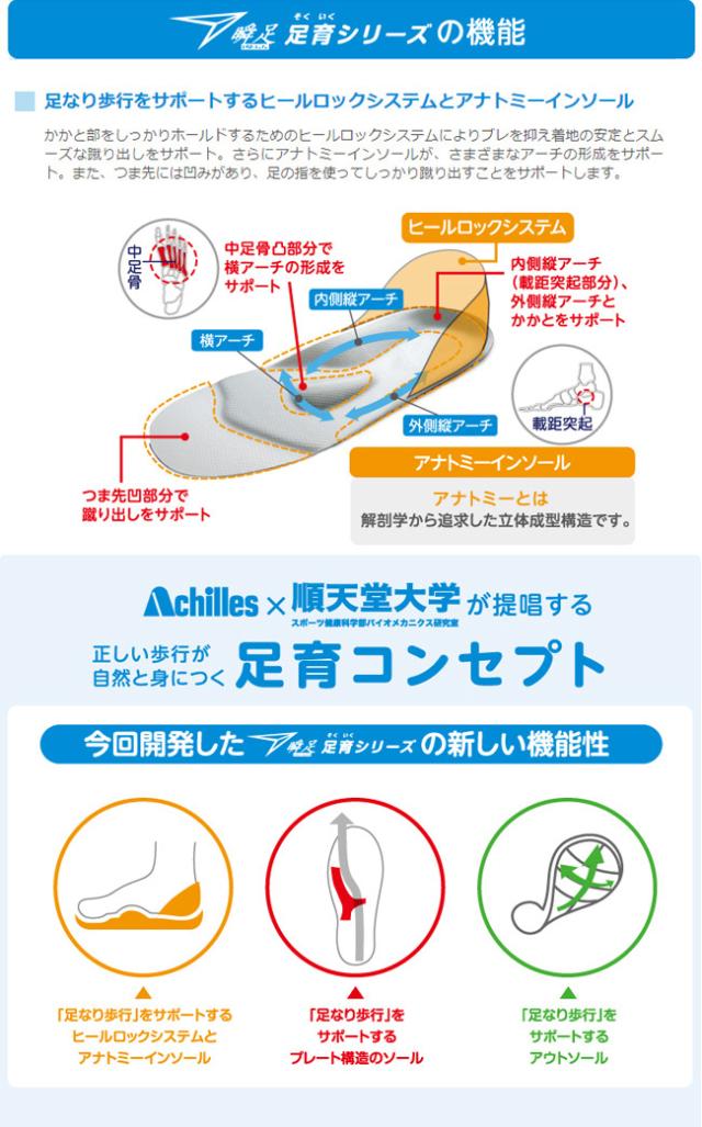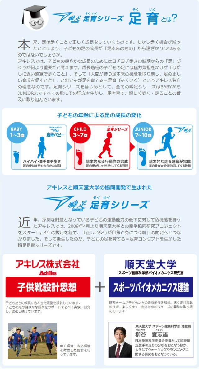 「瞬足」は足の成長に合わせたラスト(足型)設計、履き心地への配慮、足への負担軽減など、足の機能を育てる足育(そくいく)思想に基づいて設計されているジュニアスポーツシューズブランドです。アキレスは子供の健やかな成長に配慮し、幼い時期からの「足」づくりが重要だと考えています。