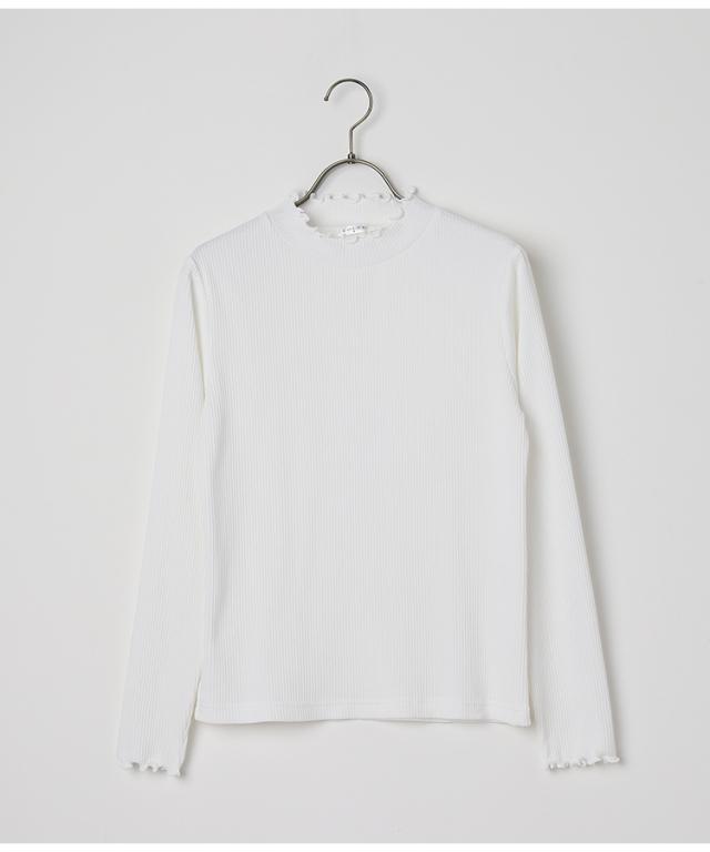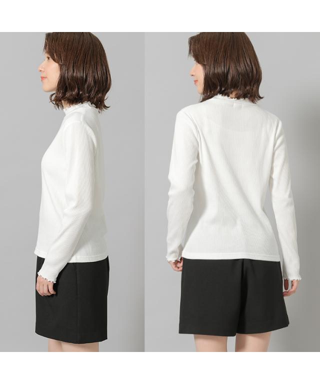 縦ラインがすっきり見えを叶えるプチハイネックトップスは、メローロックでさりげない甘さをプラス。