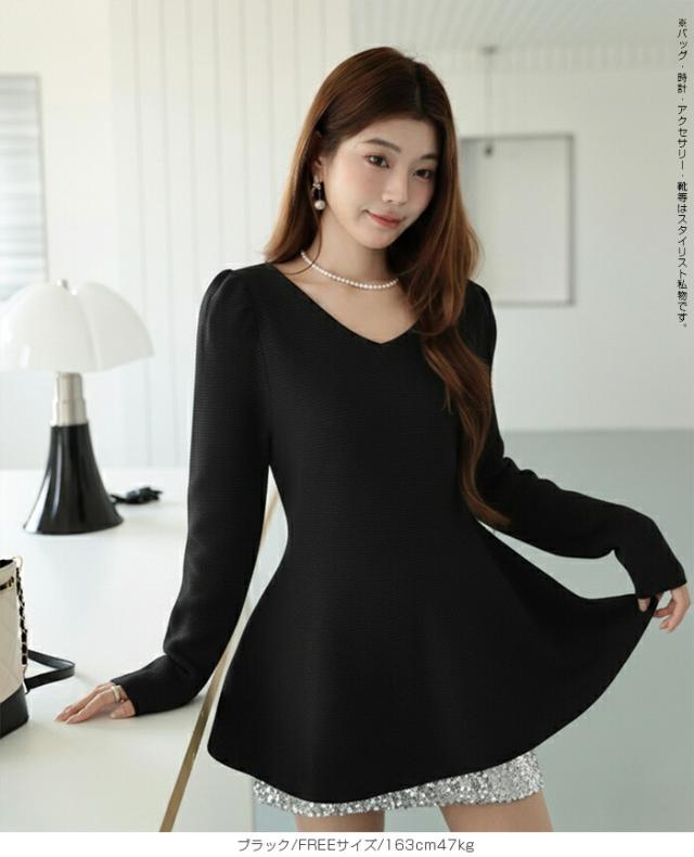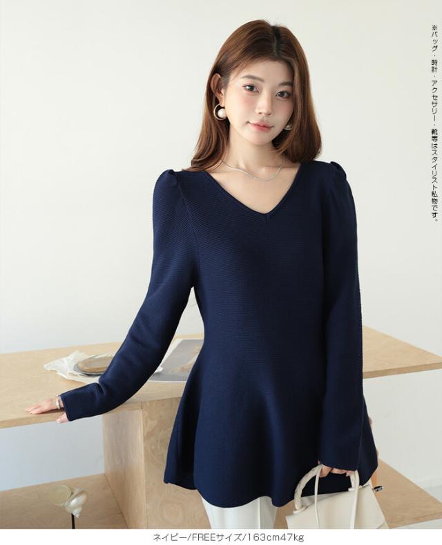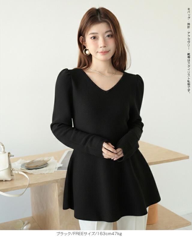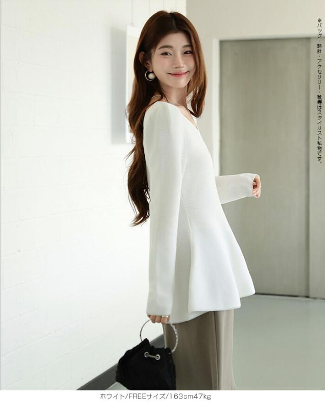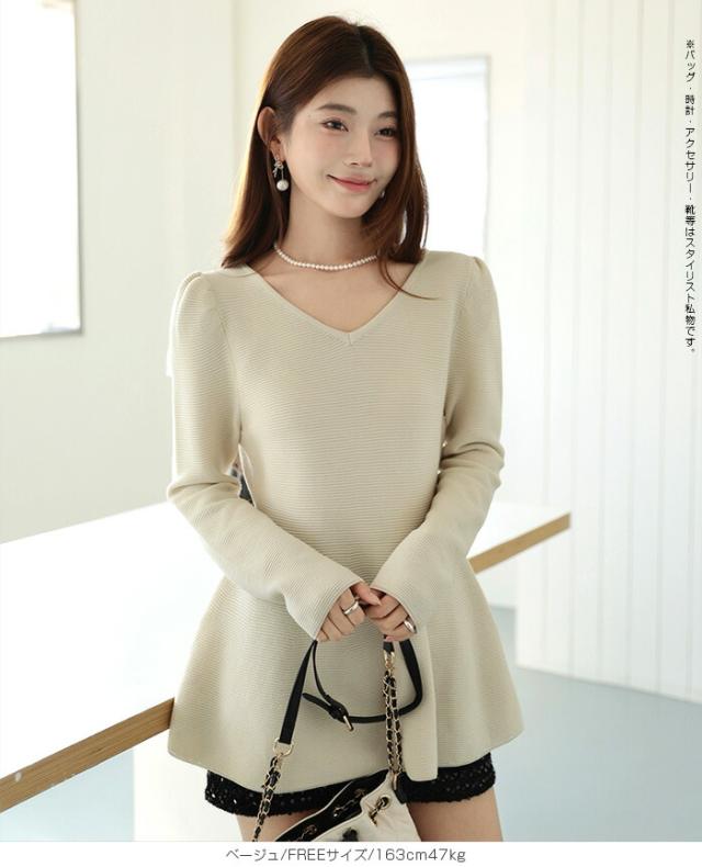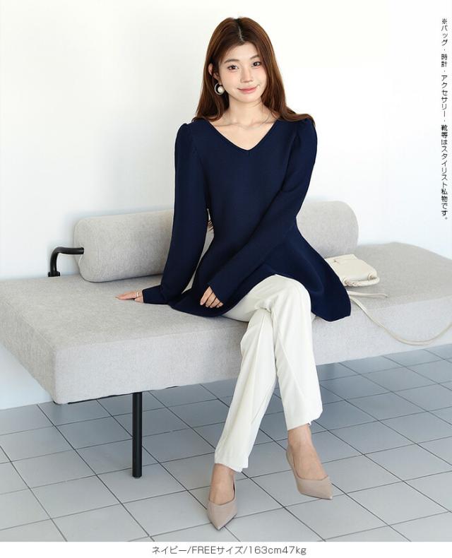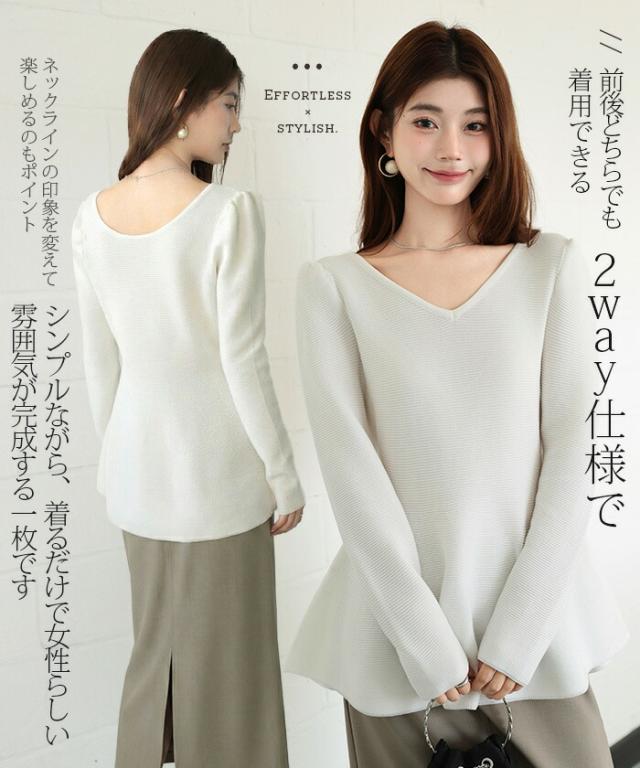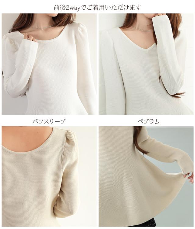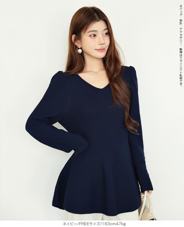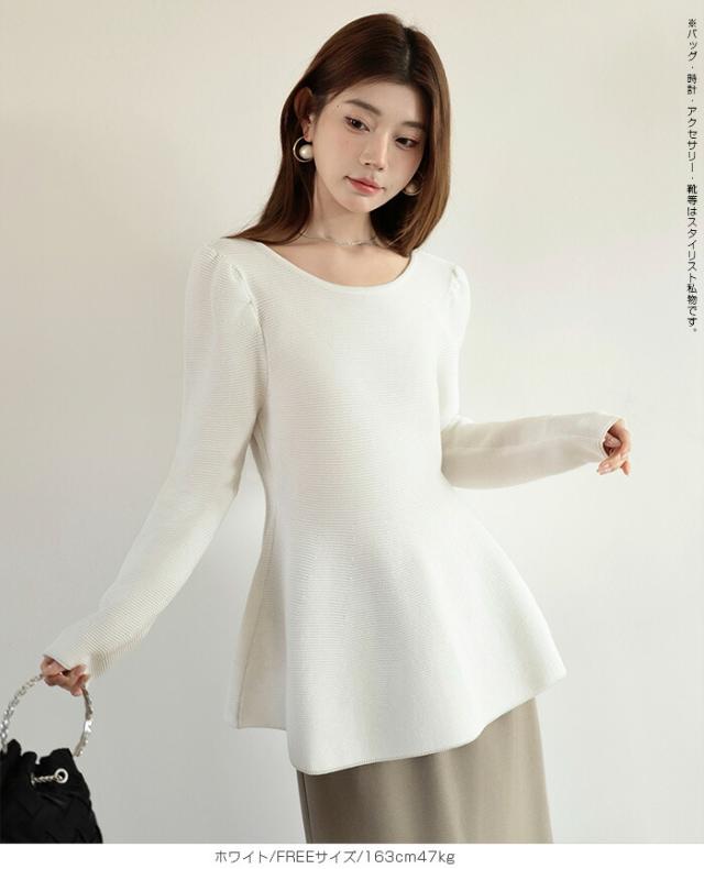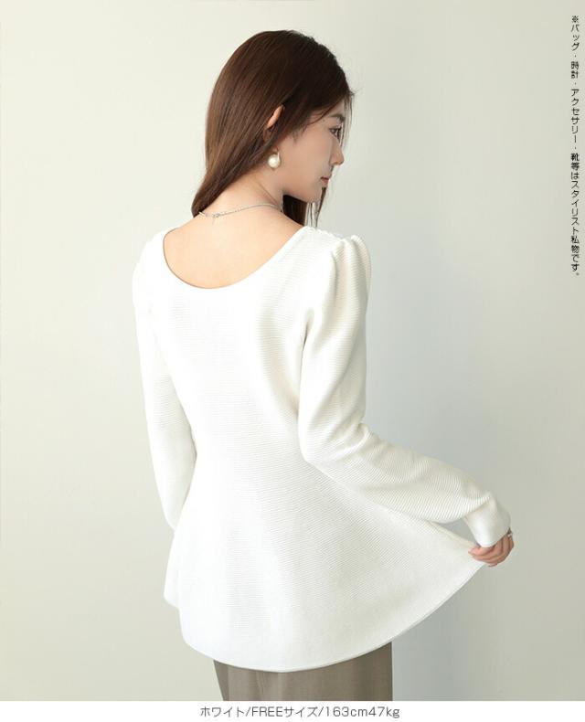 【ミニパフスリーブ2wayペプラムトップス 】 ふんわりと広がるフレアラインが魅力の、 2way仕様ペプラムニットトップス。 前後どちらでも着られるデザインで、 Vネックとラウンドネックを 気分やシーンに合わせて楽しめます。 程よくボリュームのあるパフスリーブが、 女性らしさをプラスしつつ二の腕を自然にカバー。 ウエスト下から広がるシルエットで、 体型を拾わずスタイルアップ効果も◎ きれいめにもカジュアルにも着回せる万能さで、 デイリーはもちろん、 入学式・卒業式などのオケージョンシーンにもおすすめです。 《商品ポイント》 前後2way仕様でネックラインをアレンジ可能 Vネック/ラウンドネックの2パターン着用 ペプラムシルエットで体型カバー ミニパフスリーブで二の腕すっきり 1枚でコーデが華やぐ主役トップス きれいめにもカジュアルにも対応 オンオフ兼用デザイン オケージョンにも使える上品感 《デザイン・シルエット》 ウエスト下から自然に広がるフレアライン コンパクトすぎず程よくゆとりのある身幅 肩まわりに丸みを持たせたパフスリーブ 前後差のないすっきり丈感 女性らしさときれいめ感を両立したシルエット 《コーディネート提案》 テーパードパンツやスラックスと合わせて通勤スタイルに フレアスカートと合わせてフェミニンコーデ デニムと合わせてきれいめカジュアルに ジャケットのインナーにしてセレモニー仕様に アクセやパンプスを合わせてオケージョン対応も◎ 《サイズ・カラーバリエーション》 サイズ:FREE (程よくゆとりのあるフリーサイズ設計) カラー展開例 ・ホワイト ・ブラック ・ベージュ ・ネイビー ※淡色はやや透け感がございます。 《素材・機能性》 素材:ポリエステル混ニット さらっとした肌触りでロングシーズン対応 程よい厚みで春・秋に最適 伸縮性ありで着心地ラク シワになりにくくお手入れ簡単 軽量で長時間着用もストレスフリー" |