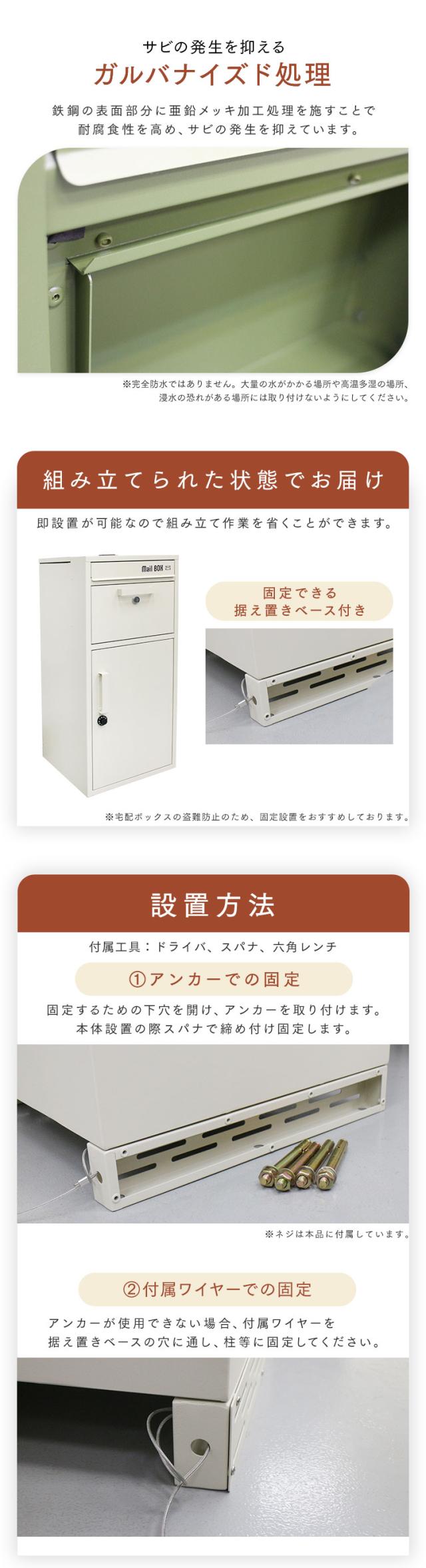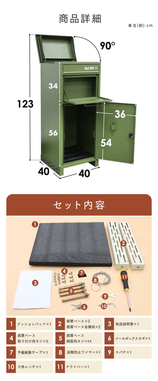 ■商品サイズ(cm):幅約40×奥行約40×高さ約96■商品重量:約17kg■材質:亜鉛メッキ鋼板■部品:本体×1、据え置きベース×2、据え置きベース金属板×2、盗難防止ワイヤー、アンカー×4、据え置きベース取り付け用ネジ×6、据え置きベース側面用ネジ×14(予備×2)、クッションパッド×1、印鑑入れ×1、メールボックスカギ×1、予備緩衝テープ×1、組み立て工具(ドライバー・スパナ・六角レンチ×各1)