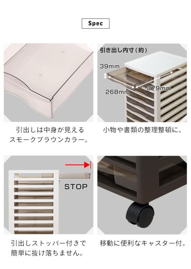 中身がみえるクリアタイプの引出しはペンや付箋紙などの小物類、書類などの整理に最適。
