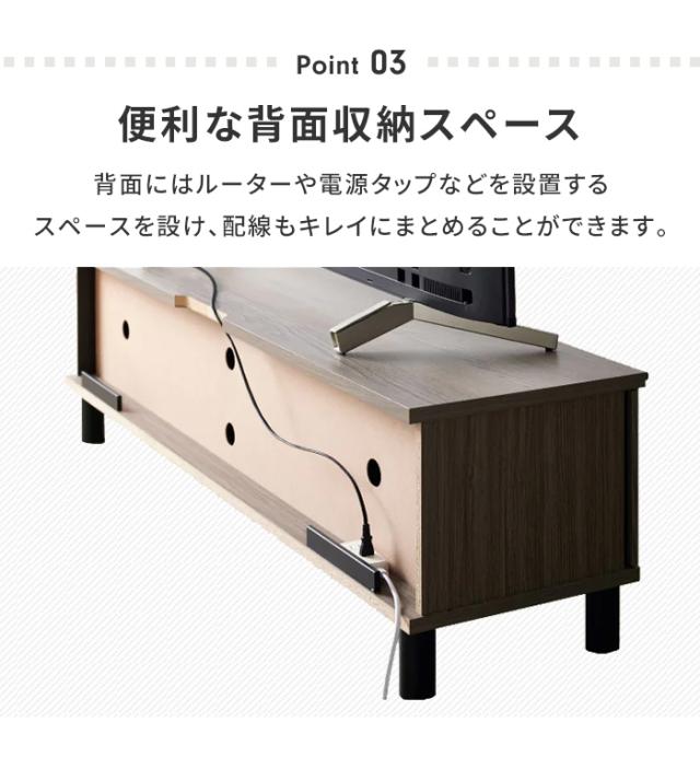| シックなグレー木目シリーズのローボード。 アクセントのブラックとの組み合わせがモダンでありながら落ち着いた優しい雰囲気を演出します。 天板に配線用の切り欠きがあり壁面にぴったりつけて配置が出来ます。 背面にはルーターや電源タップなどを設置するスペースを設け、配線もきれいにまとめることができるコード収納スペース付き。 脚の高さは110mmあり、一般的なロボット掃除機が通れる高さに設定。 |