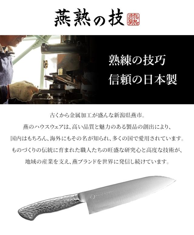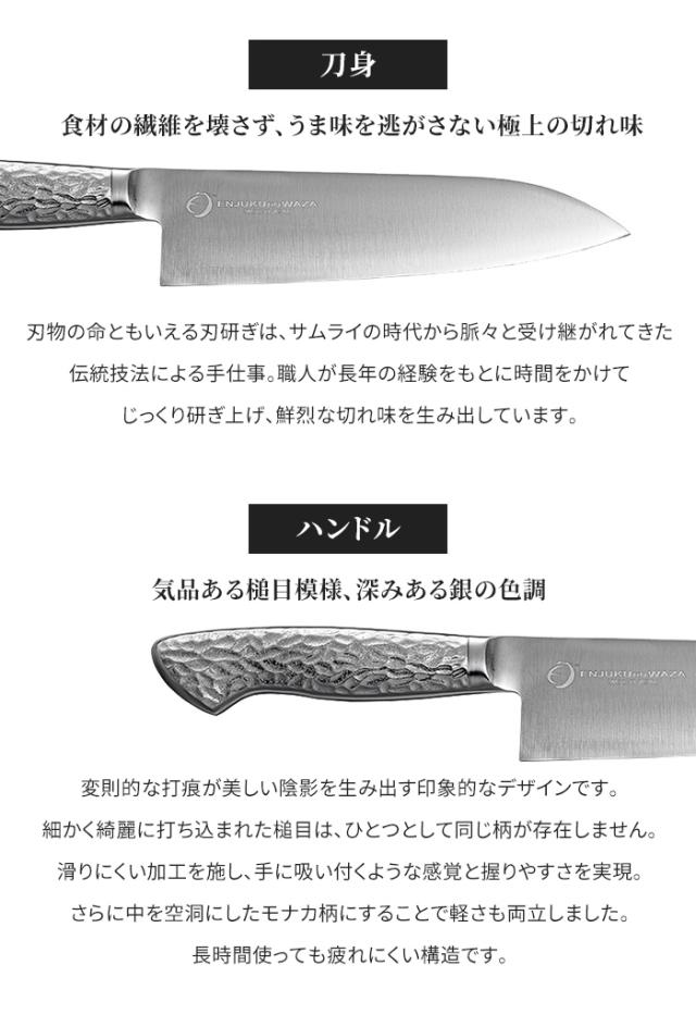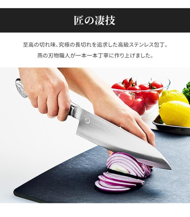 | 〜匠の凄技〜 食材を美味しく、そして美しく調理するために至高の切れ味、究極の長切れを追求した高級ステンレス包丁。 [刀身] 食材の繊維を壊さず、うま味を逃がさない極上の切れ味。 刃物の命ともいえる刃研ぎは、サムライの時代から脈々と受け継がれてきた伝統技法による手仕事。 職人が長年の経験をもとに時間をかけてじっくり研ぎ上げ、鮮烈な切れ味を生み出しています。 [ハンドル] 気品ある槌目模様、深みある銀の色調。 変則的な打痕が美しい陰影を生み出す印象的なデザインです。槌目の上に滑りにくい加工を施し、手に吸い付くような感覚と握りやすさを実現。 さらに中を空洞にしたモナカ柄にすることで軽さも両立しました。 長時間使っても疲れにくい構造です。 |