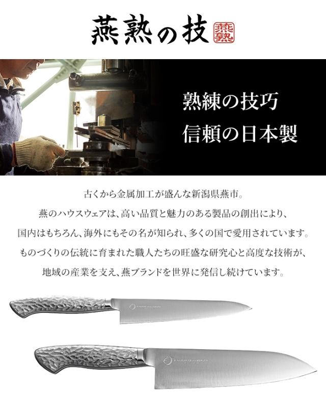 | 〜匠の凄技〜 食材を美味しく、そして美しく調理するために至高の切れ味、究極の長切れを追求した高級ステンレス包丁。 [刀身] 食材の繊維を壊さず、うま味を逃がさない極上の切れ味。 刃物の命ともいえる刃研ぎは、サムライの時代から脈々と受け継がれてきた伝統技法による手仕事。 職人が長年の経験をもとに時間をかけてじっくり研ぎ上げ、鮮烈な切れ味を生み出しています。 [ハンドル] 気品ある槌目模様、深みある銀の色調。 変則的な打痕が美しい陰影を生み出す印象的なデザインです。槌目の上に滑りにくい加工を施し、手に吸い付くような感覚と握りやすさを実現。 さらに中を空洞にしたモナカ柄にすることで軽さも両立しました。 長時間使っても疲れにくい構造です。 |