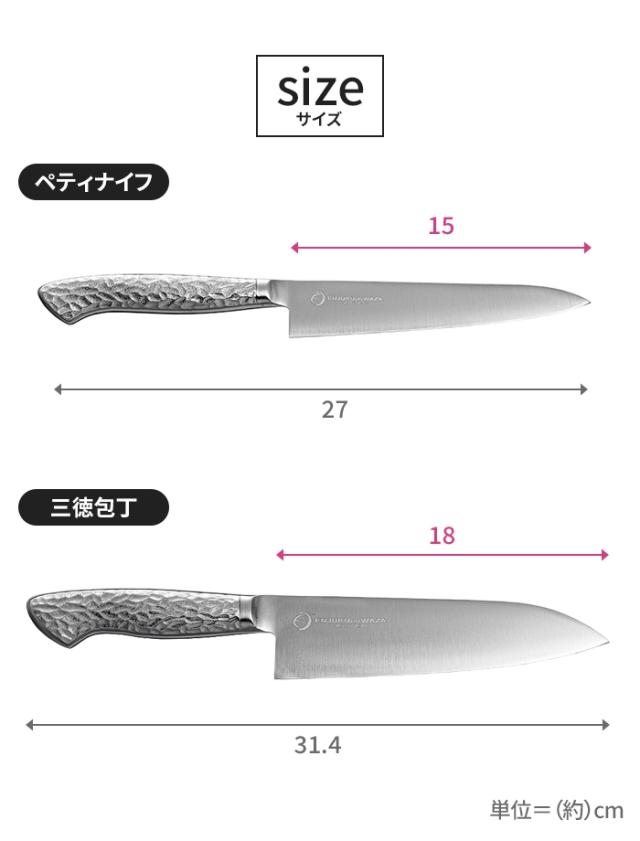 | [ペティナイフ]約全長27cm (刃渡り15cm) [三徳包丁]約全長31.4cm (刃渡り18cm) |