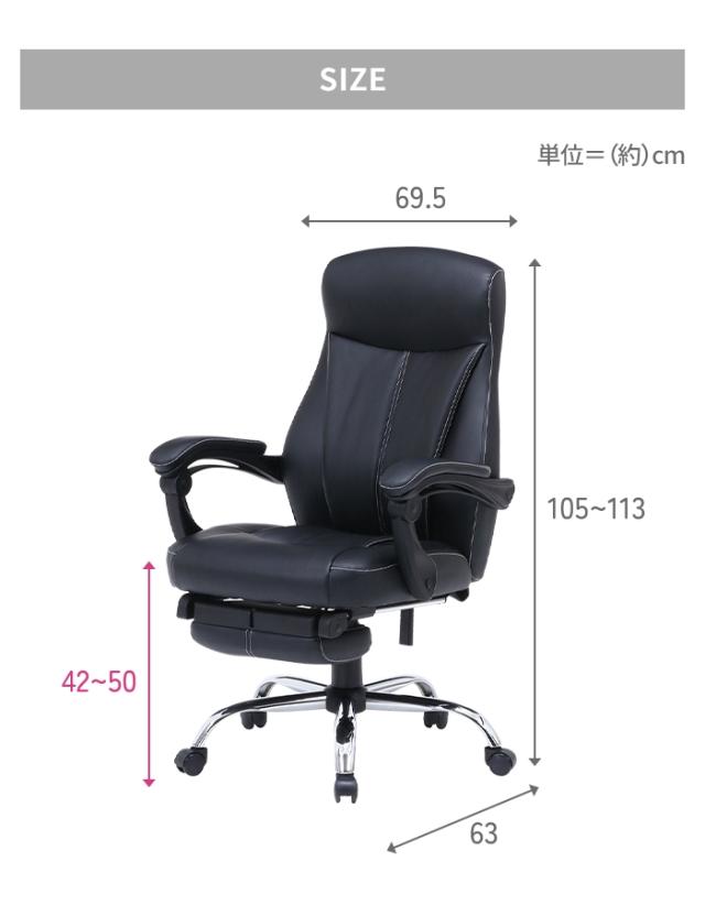 | 充実の機能を備えたオフィスチェア。 PUレザーの質感とシックなカラーリングが、自宅にもオフィスにもマッチする上質なデザイン。 背もたれは140度リクライニング、肘掛けの角度も連動します。 足をゆったり伸ばせるフットレストは格納式なので、使わない時も邪魔になりません。 男性でもゆったりと寄りかかれる、63cmのハイバック仕様。 肌触りのよいPUレザーと柔らかなクッションが、体をしっかりと包み込み、快適な座り心地。 昇降機能・アームレスト・ロッキング機能付き。 |