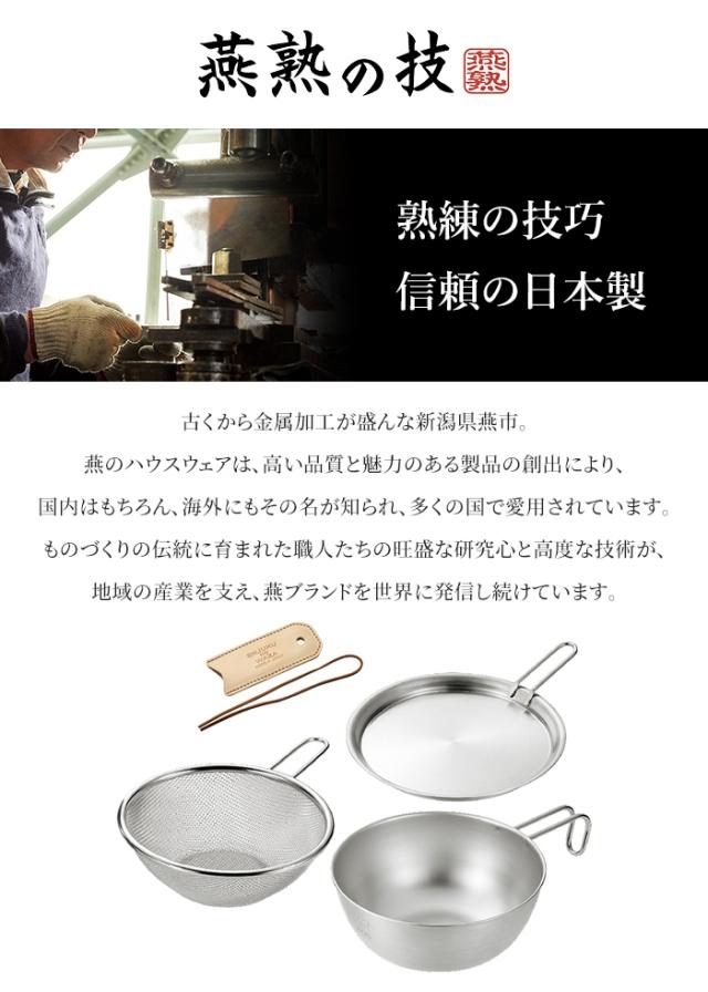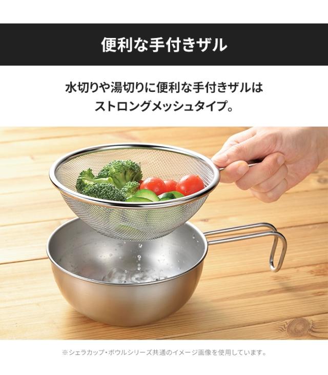 キーワード:キャンプ用品 シェラカップ・ボウルセット 18cm 手付きザル付 蓋トレー付 レザーカバー付 ステンレス製 直火 コンパクト 軽量 スタッキング アウトドア 便利 調理器具 キャンプ 水切り BBQ バーベキュー