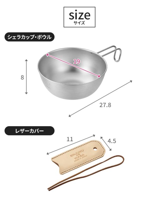 【値下げ】シェラカップ・ボウルセット 18cm 手付きザル付 蓋トレー付 レザーカバー付 ステンレス製 直火 コンパクト 軽量 キャンプ用品