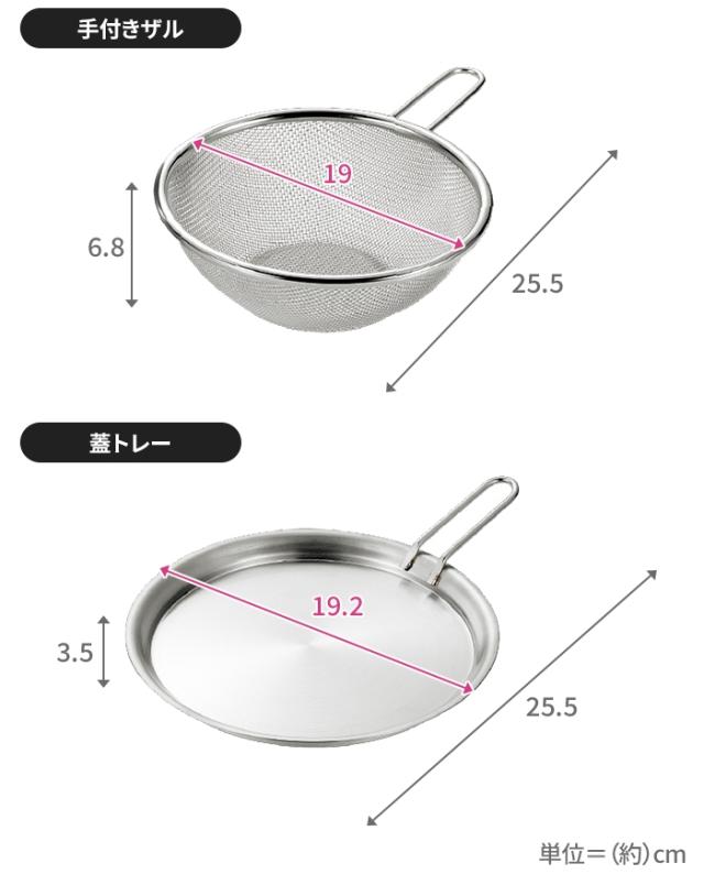 | [ボウル]約幅19×奥行27.8×高さ8cm [手付きザル]約φ19×25.5×6.8cm [蓋トレー]約φ19.2×25.5×3.5cm [レザーカバー]約幅4.5×奥行11×高さ0.3cm |