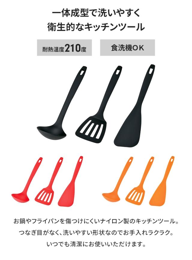 | 一体成型で洗いやすく衛生的なキッチンツールセット お玉とナーナーとヘラのセットになります。 耐熱温度210℃で食洗器にも使えます。 |