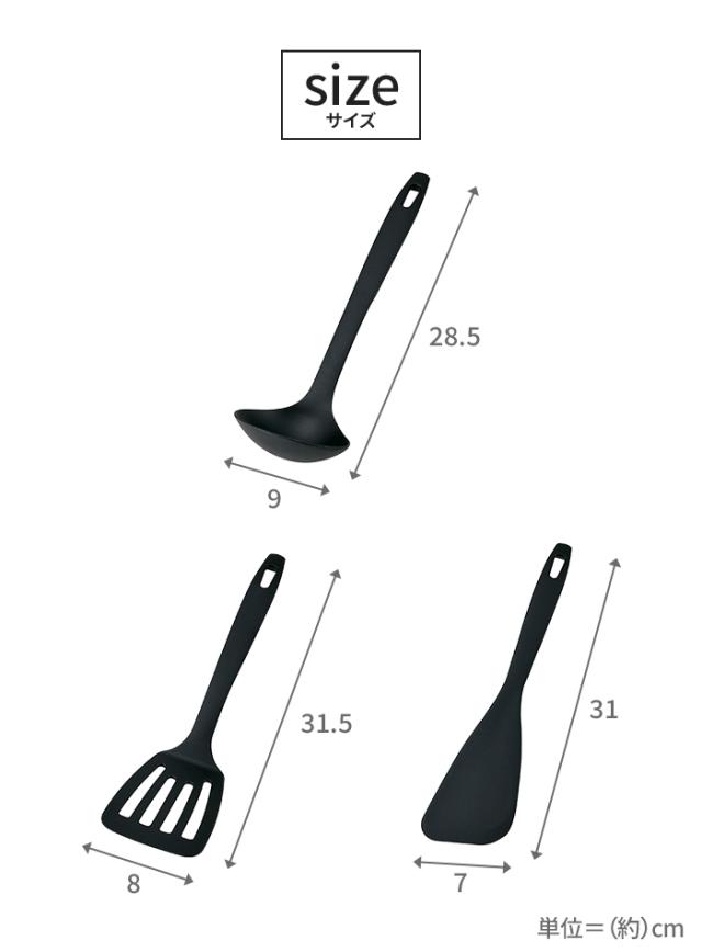 | [お玉]約9×28.5×7.5cm [ターナー]約8×31.5×5cm [ヘラ]約7×31×2cm |