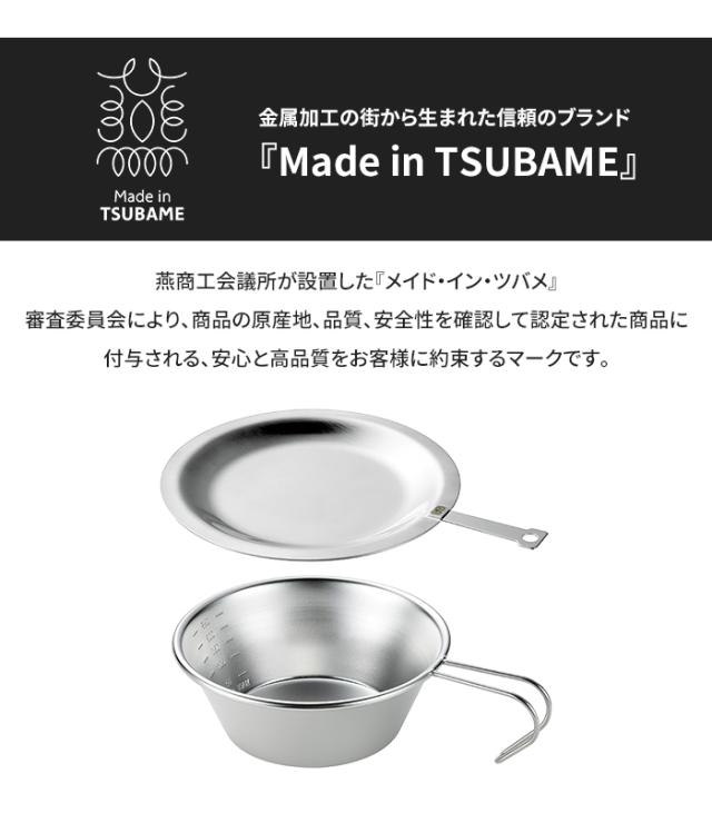 | 金属加工の街から生まれた信頼のブランド『Made in TSUBAME』 (ものづくりのまち新潟県燕市で燕商工会議所が設置した『メイド・イン・ツバメ』審査委員会により、 商品の原産地、品質、安全性を確認して認定された商品に付与される、 安心と更新櫃をお客様に約束するマークです。) 安心の100%国産! カップはもちろん、湯沸かしや調理まで、 マルチに使えるアウトドアの必須アイテムのステンレス製のシェラカップです。 |