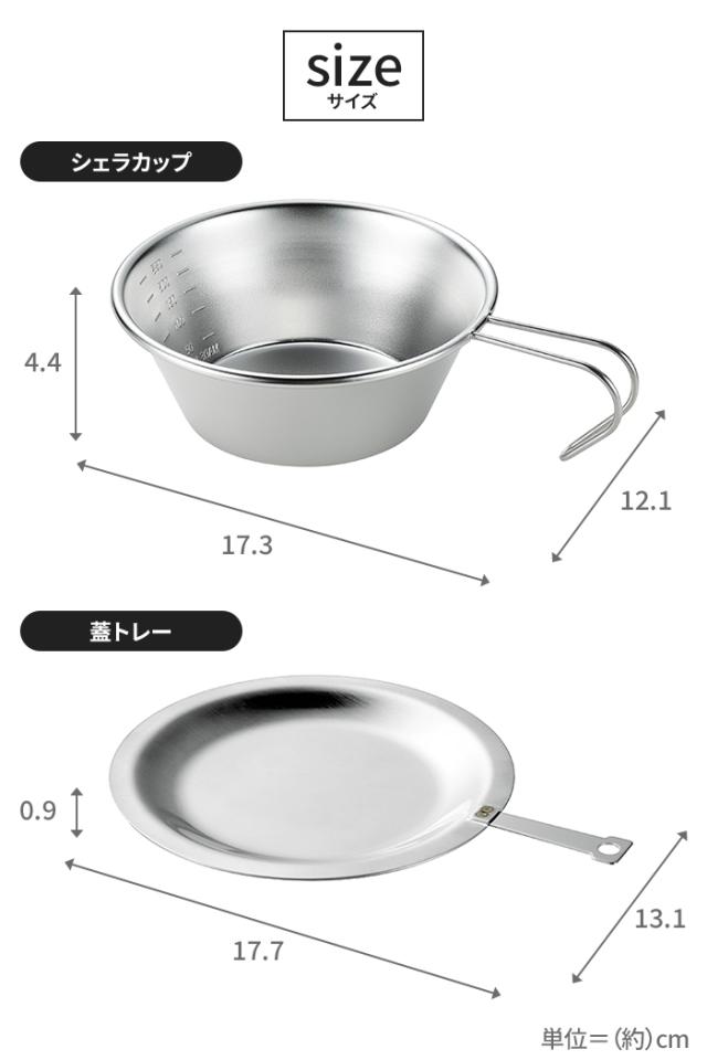 | [ステンレスシェラカップ330ml]約17.3×12.1×4.4cm [蓋]約17.7×13.1×0.9cm |