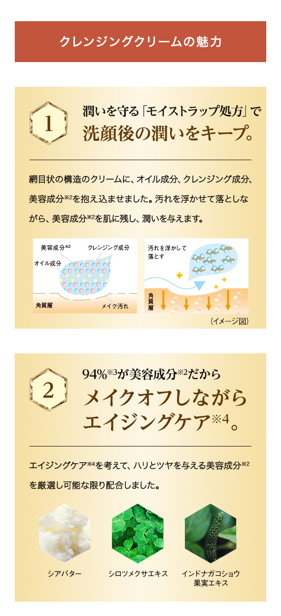 美容成分94%配合※1。ハリツヤあふれるしっとり素肌へ洗い上げる贅沢な高保湿クレンジングクリーム。マッサージクリームとしてもお使いいただけます。独自のハニーブーストヴェール※2で肌を包み、コンディションを整えます。