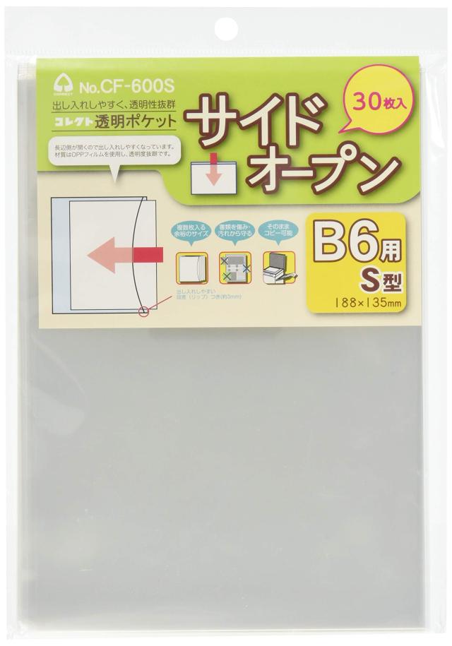 サイズ違いの書類や切り抜きを同じ大きさで整理・保管が出来る透明ポケット<br>長辺口が開くから、間口が広く出入れ簡単なサイドオープンタイプ。透明度の高いOPPを使用。<br>B6用 (縦135mmx横188mm)・30枚入り<br>【用途例】B6判、伝票、キャビネ判(120mmx165mm)、CD(120mmx120mm)など<br>◆商品名:コレクト クリアポケット サイドオープン B6用 30枚 CF-600S<br>サイズ違いの書類や切抜きなど、同じ大きさで整理・保管が出来るコレクトの透明ポケット。