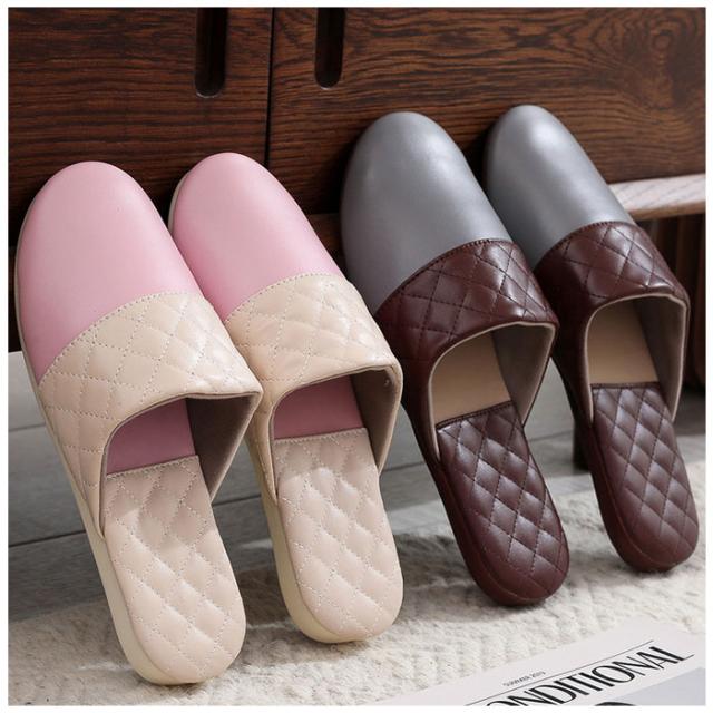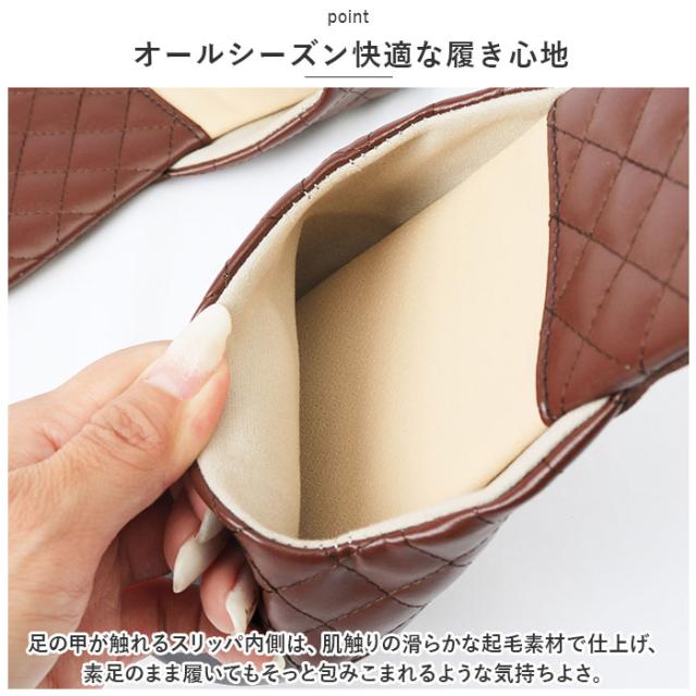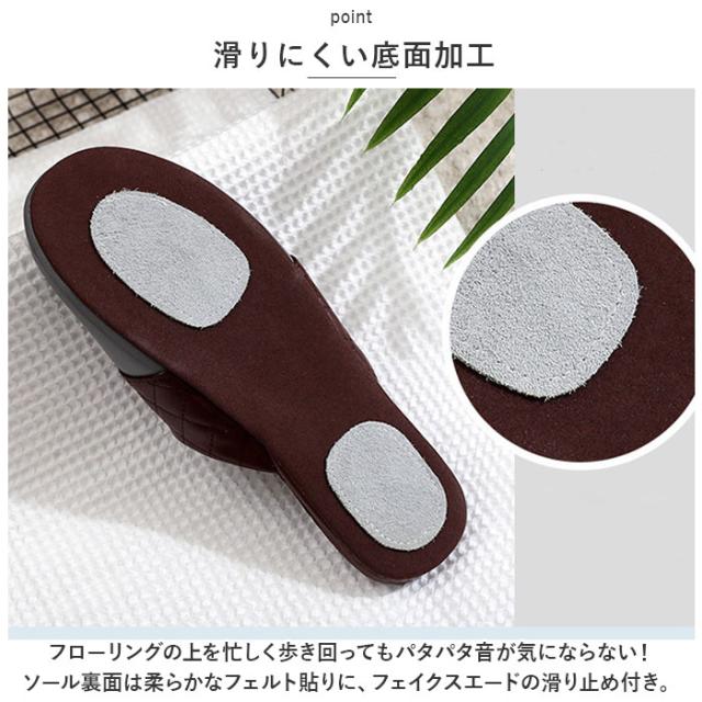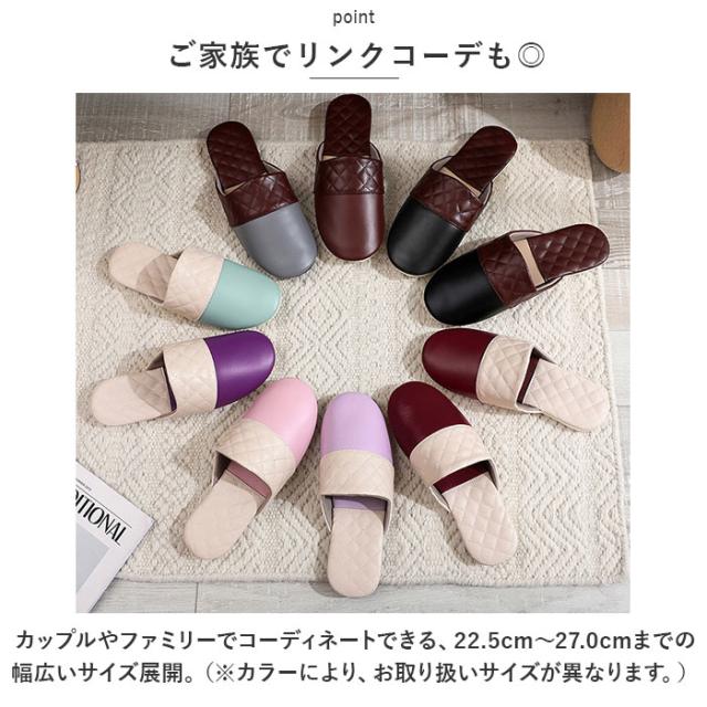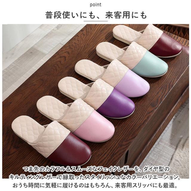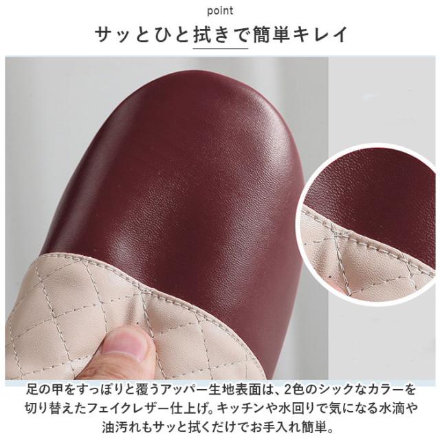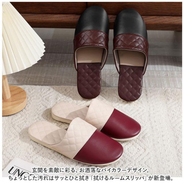 | 商品説明 | ・玄関を素敵に彩る、お洒落なバイカラーデザイン。ちょっとした汚れはサッとひと拭き「拭けるルームスリッパ」が新登場。 【サッとひと拭きで簡単キレイ】 ・足の甲をすっぽりと覆うアッパー生地表面は、2色のシックなカラーを切り替えたフェイクレザー仕上げ。キッチンや水回りで気になる水滴や油汚れもサッと拭くだけでお手入れ簡単。 【軽くて屈曲性に優れたソール】 ・厚みを抑えたインソールかかと部分には、キルティングステッチを施したPUレザーマットを使用。屈曲性に優れたPVC素材を内蔵しているので、歩きやすく軽快な履き心地。 【オールシーズン快適な履き心地】 ・足の甲が触れるスリッパ内側は、肌触りの滑らかな起毛素材で仕上げ、素足のまま履いてもそっと包みこまれるような気持ちよさ。 【滑りにくい底面加工】 ・フローリングの上を忙しく歩き回ってもパタパタ音が気にならない!ソール裏面は柔らかなフェルト貼りに、フェイクスエードの滑り止め付き。 【ご家族でリンクコーデも◎】 ・カップルやファミリーでコーディネートできる、22.5cm〜27.0cmまでの幅広いサイズ展開。(※カラーにより、お取り扱いサイズが異なります。) 【普段使いにも、来客用にも】 ・つま先のカラフル&スムーズなフェイクレザーを、ダイヤ型のキルティングレザーで縁取ったスタイリッシュなカラーバリエーション。おうち時間に気軽に履けるのはもちろん、来客用スリッパにも最適。 |