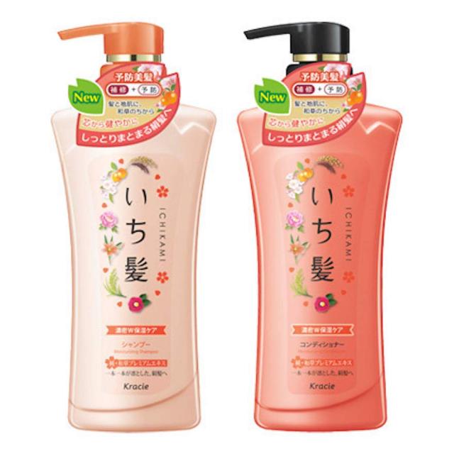 ◆商品名:いち髪シャンプー&コンディショナーペアセット(濃密W保湿)<br>日本人の毛髪を美しくするため、和草のちからで、補修&予防する予防美髪ケアシリーズ。ほろ甘いあんずと上品な桜三分咲きの香り。濃密な泡で、乾燥によるダメージを補修+予防、しっとりまとまる絹髪に仕上げます。