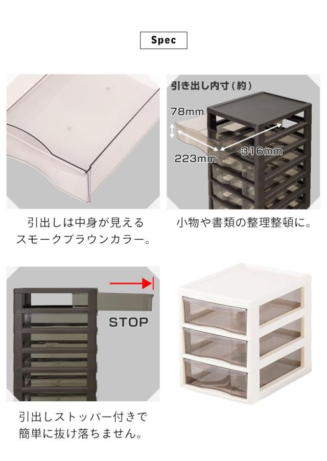 中身がみえるクリアタイプの引出しはペンや付箋紙などの小物類、書類などの整理に最適。