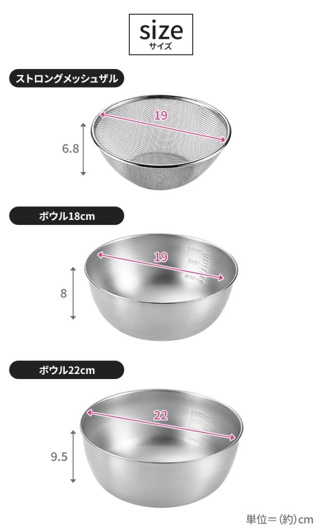 | [メッシュザル19cm]約幅φ19×H6.8cm [ボウル18cm]約幅φ19×H8cm [ボウル21cm]約幅φ22×H9.5cm |
