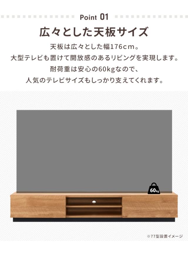 キーワード:ローボード 幅176 テレビ台 テレビボード TV台 〜77V 大容量 収納 棚付き 木目調 ナチュラル おしゃれ シンプル 上品 TVボード 木製 扉付き テレビラック 収納棚 AVボード AVラック ロータイプ 77型 北欧風 収納家具 リビング家具 おしゃれ家具 インテリア コード穴 便利