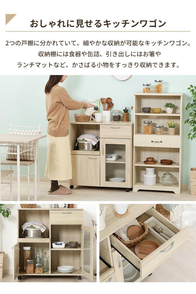 | 炊飯器も収納できる、キッチンワゴン。 2つの戸棚に分かれていて、細やかな収納が可能。 食器や缶詰、お菓子などスッキリ収納できます。 お好みの高さに合わせて、棚の付け替えができます。 引き出して使えるスライド棚は炊飯時やお湯を沸かす際に出して使うことで、蒸気による棚の劣化を防ぐことができます。 引き出しにはお箸やランチマットなど、かさばる小物をすっきり収納できます。 キャスター付きなので移動やお掃除もラクラク。 5つのキャスターがついているので安定感もあります。 |