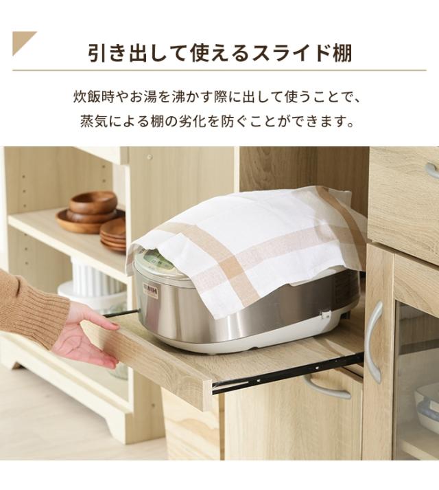 引き出して使えるスライド棚は炊飯時やお湯を沸かす際に出して使うことで、蒸気による棚の劣化を防ぐことができます。