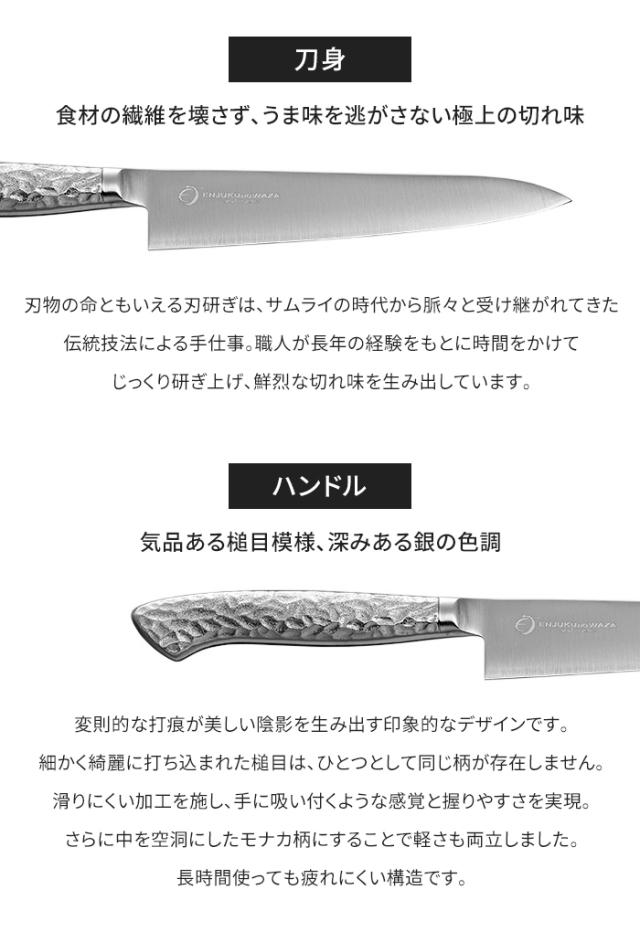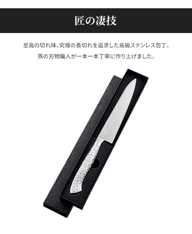 | 〜匠の凄技〜 食材を美味しく、そして美しく調理するために至高の切れ味、究極の長切れを追求した高級ステンレス包丁。 [刀身] 食材の繊維を壊さず、うま味を逃がさない極上の切れ味。 刃物の命ともいえる刃研ぎは、サムライの時代から脈々と受け継がれてきた伝統技法による手仕事。 職人が長年の経験をもとに時間をかけてじっくり研ぎ上げ、鮮烈な切れ味を生み出しています。 [ハンドル] 気品ある槌目模様、深みある銀の色調。 変則的な打痕が美しい陰影を生み出す印象的なデザインです。槌目の上に滑りにくい加工を施し、手に吸い付くような感覚と握りやすさを実現。 さらに中を空洞にしたモナカ柄にすることで軽さも両立しました。 長時間使っても疲れにくい構造です。 |