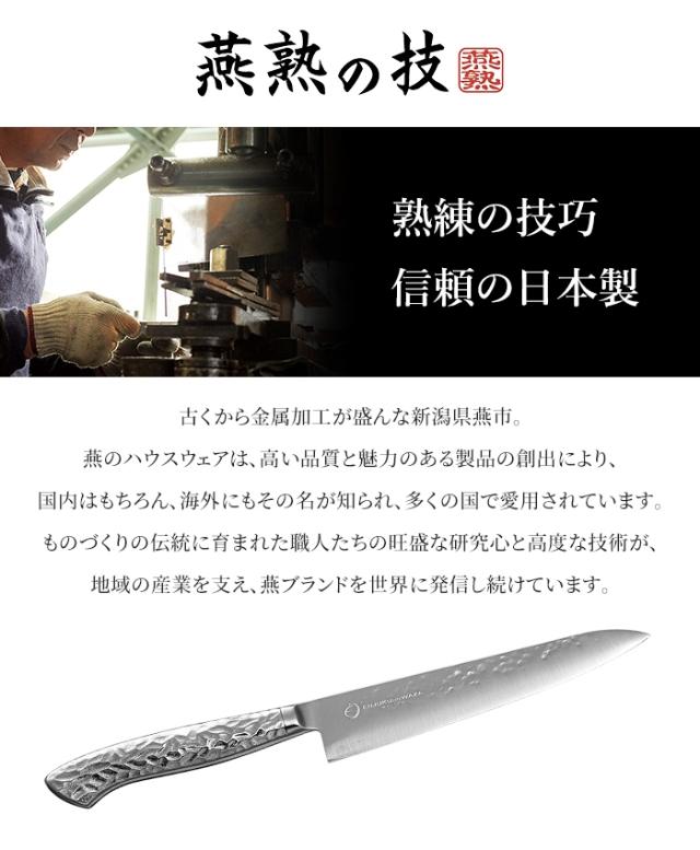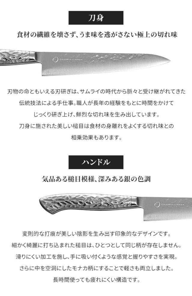 | 〜匠の凄技〜 食材を美味しく、そして美しく調理するために至高の切れ味、究極の長切れを追求した高級ステンレス包丁。 [刀身] 食材の繊維を壊さず、うま味を逃がさない極上の切れ味。 刃物の命ともいえる刃研ぎは、サムライの時代から脈々と受け継がれてきた伝統技法による手仕事。 職人が長年の経験をもとに時間をかけてじっくり研ぎ上げ、鮮烈な切れ味を生み出しています。 [槌目] 魅力的なデザインと機能性。 細かく綺麗に打ち込まれた槌目は、ひとつとして同じ模様が存在しません。 食材の身離れをよくする切れ味との相乗効果もあります。 [ハンドル] 気品ある槌目模様、深みある銀の色調。 変則的な打痕が美しい陰影を生み出す印象的なデザインです。槌目の上に滑りにくい加工を施し、手に吸い付くような感覚と握りやすさを実現。 さらに中を空洞にしたモナカ柄にすることで軽さも両立しました。 長時間使っても疲れにくい構造です。 |