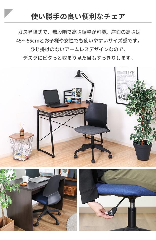 | 省スペースにサッと収まるオフィスチェア。 ひじ掛けのないアームレスデザインなので、デスクにピタっと収まり見た目もすっきり。 ポリエステル生地にウレタンフォームを使用した座面で快適な座り心地。 シェル型の背もたれが腰にしっかりフィットして疲れにくい作りになっています。 ガス昇降式で、無段階で高さ調整が可能。 座面の高さは45〜55cmとお子様や女性でも使いやすいサイズです。 |