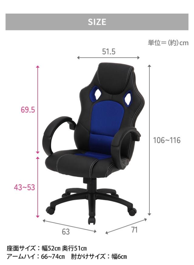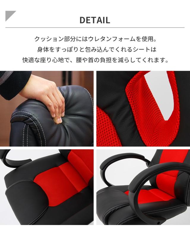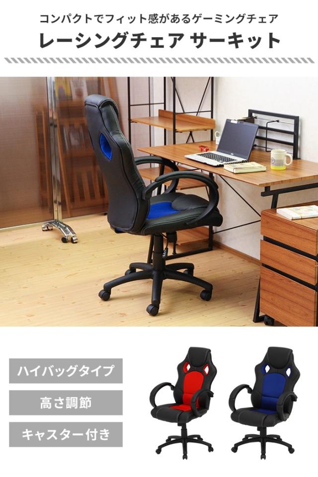 | 頭まで支えるハイバック仕様のレーシングチェア。 ガス昇降式でデスクや体型に合わせて高さ調節ができます。 クッション部分にはウレタンフォームを使用。 身体をすっぽりと包み込んでくれるシートは快適な座り心地で、腰や首の負担を軽減してくれます。 キャスター付きで移動もラクラク。 |