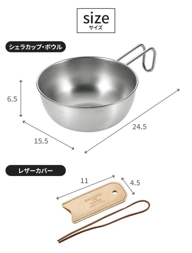 【値下げ】シェラカップ・ボウルセット 15cm 手付きザル付 蓋トレー付 レザーカバー付 ステンレス製 直火 コンパクト 軽量 キャンプ用品
